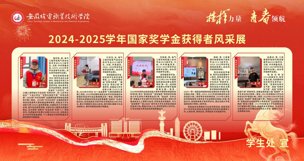 曾获国家奖学金、国家励志奖学金;斩获2025年CIMC中国智能制造挑战赛全国特等奖(第一名)、连续两年高教社杯数学建模竞赛全国一等奖、2025年世界职业院校技能大赛争夺赛铜奖等国家级奖项9项;牵头“星洲科技”“极知智能”等项目获安徽省大学生创新大赛职教金奖3项、“挑战杯·华安证券”安徽省大学生课外学术科技作品竞赛二等奖1项等省级及以上荣誉30余项。积极投身志愿服务,作为“延安精神”“遵义会议”团中央大学生志愿宣讲团成员宣讲15场,覆盖300余人次;获评芜湖市三好学生,以专业技能与责任担当传递青春温度。