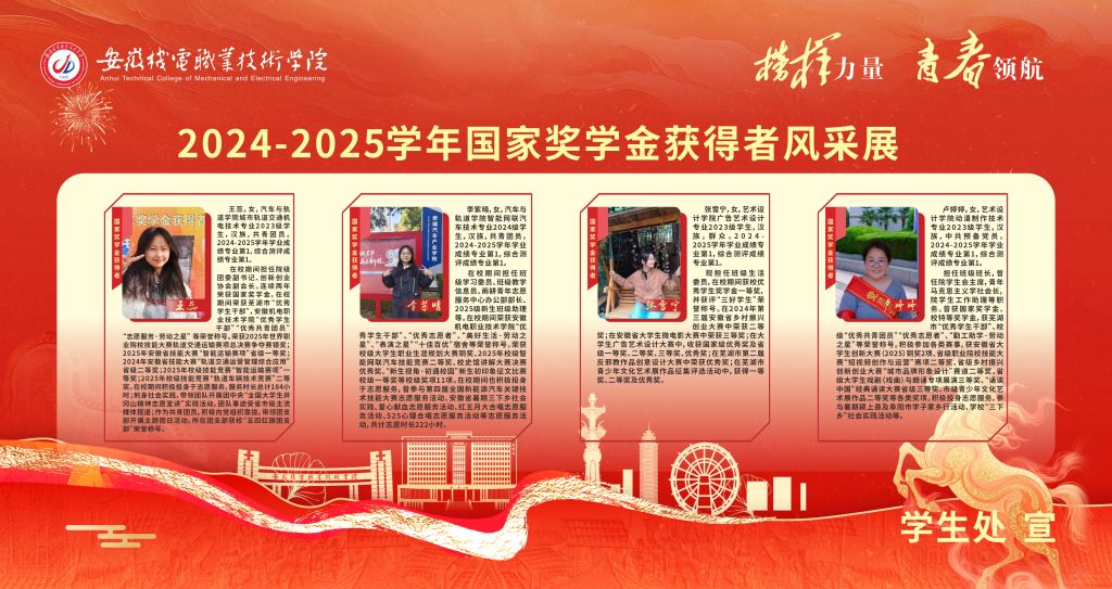 担任班级班长,曾任院学生会主席,青年马克思主义学社会长,院学生工作助理等职务。曾获国家奖学金、校特等奖学金,获芜湖市“优秀学生干部”、校级“优秀共青团员”“优秀志愿者”、“勤工助学·劳动之星”等荣誉称号。积极参加各类赛事,获安徽省大学生创新大赛(2025)铜奖2项、省级职业院校技能大赛“短视频创作与运营”赛项二等奖、省级乡村振兴创新创业大赛“城市品牌形象设计”赛道二等奖、省级大学生戏剧(戏曲)与朗诵专项展演三等奖、“诵读中国”经典诵读大赛省级三等奖、市级青少年文化艺术展作品二等奖等各类奖项。积极投身志愿服务,参与暑期颍上县及阜阳市学子家乡行活动、学校“三下乡”社会实践活动等。
