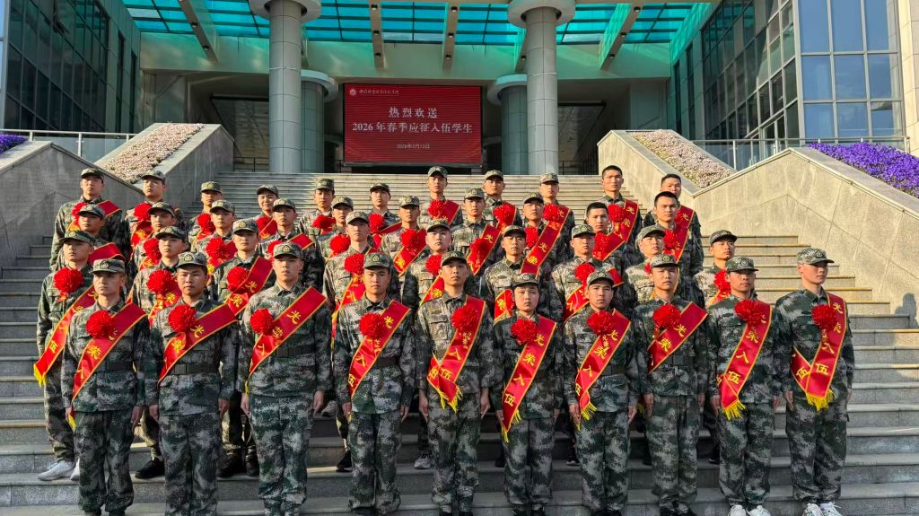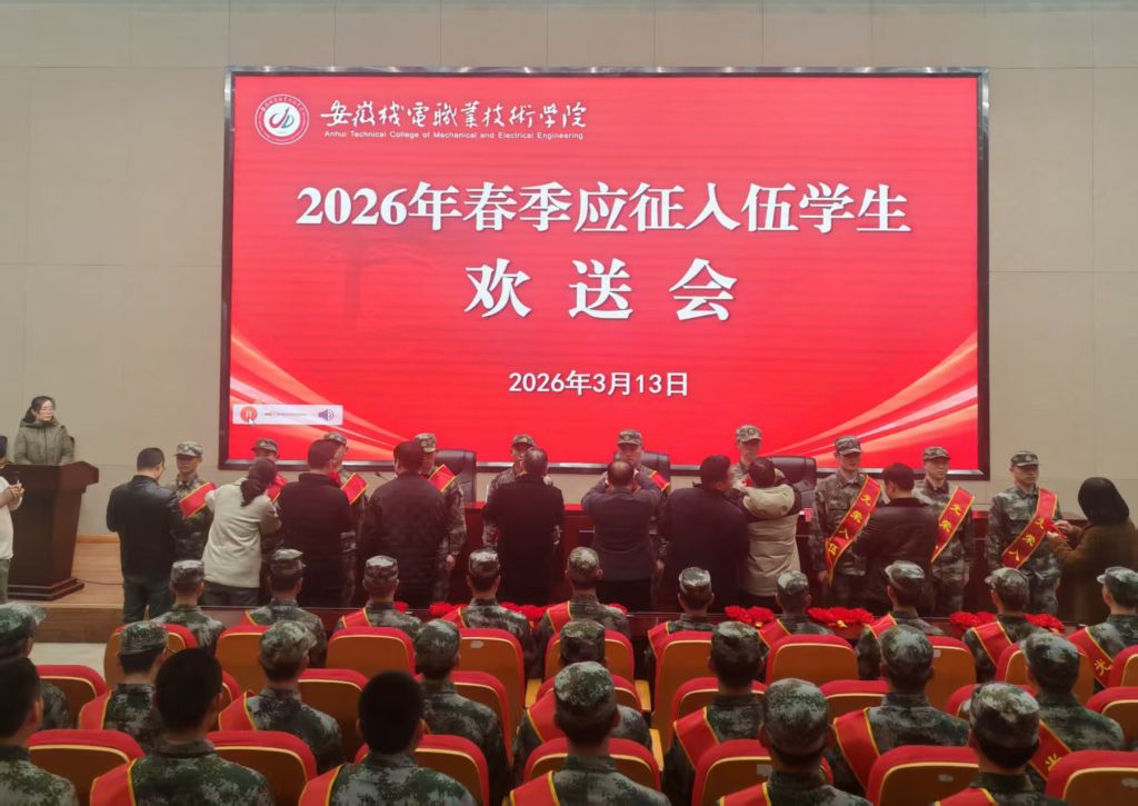 3月13日下午,学校2026年春季应征入伍学生欢送会在雨耕楼二楼报告厅隆重举行。学校党委副书记姜绳、学工部(学生处、武装部)部长王文浩、副部长尤佳、各二级学院副书记、40名入伍学生、相关辅导员及部分学生家长参加活动。